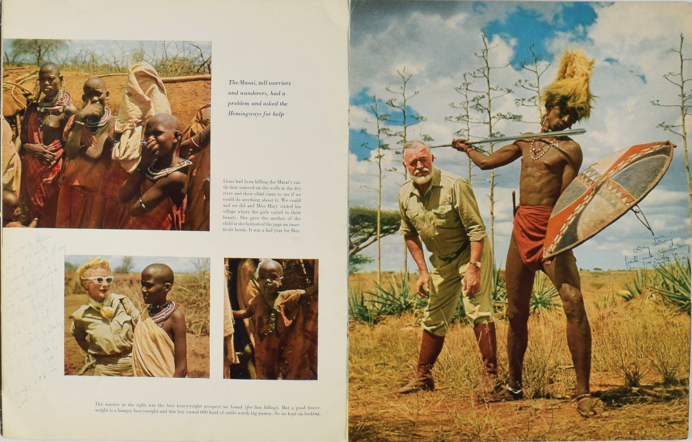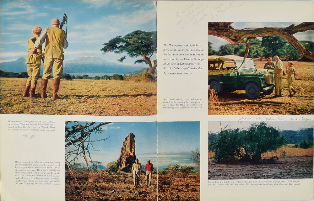 Extraordinary booklet entitled "Hemingway's First Picture Story," reprinted from Look Magazine, January 26, 1954, 16 pages, 10.5 x 13.25, signed and inscribed on the front cover in fountain pen, "For Mr. and Mrs. Ken Browne, with all best wishes always, Ernest Hemingway." The booklet has additionally been signed throughout by Hemingway and his wife Mary: on a rare full-page color image of Ernest posing with a slain cheetah, he signs, "Best luck, E. Hemingway"; on a page with an image of Kilimanjaro, he signs, "OK, EH," and on the adjacent page he signs again, "Good luck from [Mary, signed by his wife] and Papa," with an additional note by Mary, "Breakfast was sandwiches of Grant gazelle, 3 Thermoses of coffee, and 'biscuits'—M"; on a page showing Masai warriors, Mary writes, "Some of them are really beautiful—they were interested in my scarf with yellow birds on it—but said firmly 'Not for us!,' M, Temp. 106 in sun"; on a rare color full-page portrait of Ernest with a Masai warrior, he signs, "very strong, fast and rich boy, too rich to fight, EH"; on a page entitled 'Death of a Rhino,' Ernest writes, "No comment, EH"; and on a page showing Mary with a newborn Grant Gazelle, she writes, "He had a charming and well-defined character—and I miss him—M—Mary Hemingway." In very good condition, with collector's annotations to front cover, overall creasing, light staining to the front cover, and some surface loss to Hemingway's cover image.
