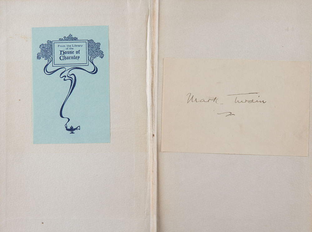 Desirable ink signature, "Mark Twain,” on an off-white 4.5 x 2.75 slip, affixed to the first free end page of the first volume of the 'Author's National Edition' of The Writings of Mark Twain, The Innocents Abroad, published by Harper & Brothers; the set is complete with 24 additional unsigned volumes. Autographic condition: fine. Book condition: VG/None, with sunning to spine and boards.
