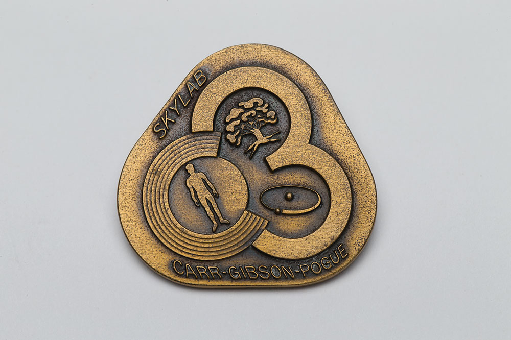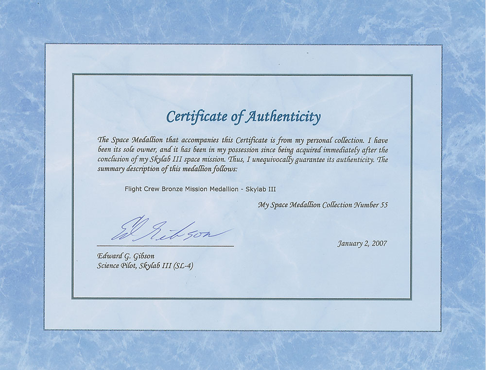 Skylab Astronaut Ed Gibson's uncommon and unflown bronze Skylab 4 (SLM-3) Robbins medal, approximately 1.5″ in diameter, with a raised mission insignia design on the face, and the reverse is engraved with the Skylab launch date of November 16, 1973, and the landing date of February 8, 1974. The medal lacks a serial number. Condition is mint state. A total of 80 bronze unflown medallions were struck for Skylab 4. Accompanied by a certificate of authenticity signed by Gibson.