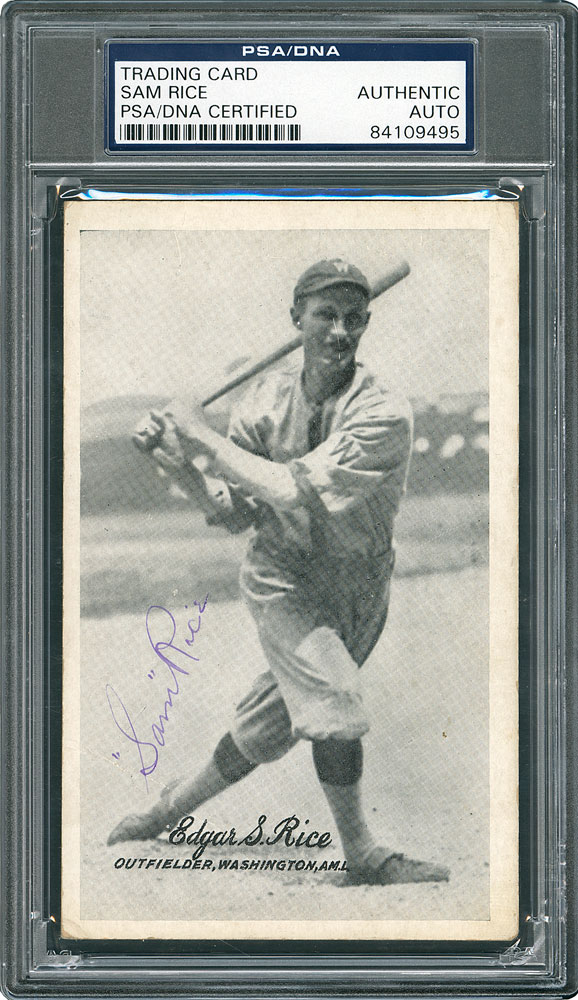 Hall of Fame outfielder Sam Rice boldly signed this 1921 Exhibit baseball card. Encapsulated in a PSA/DNA authentication holder.