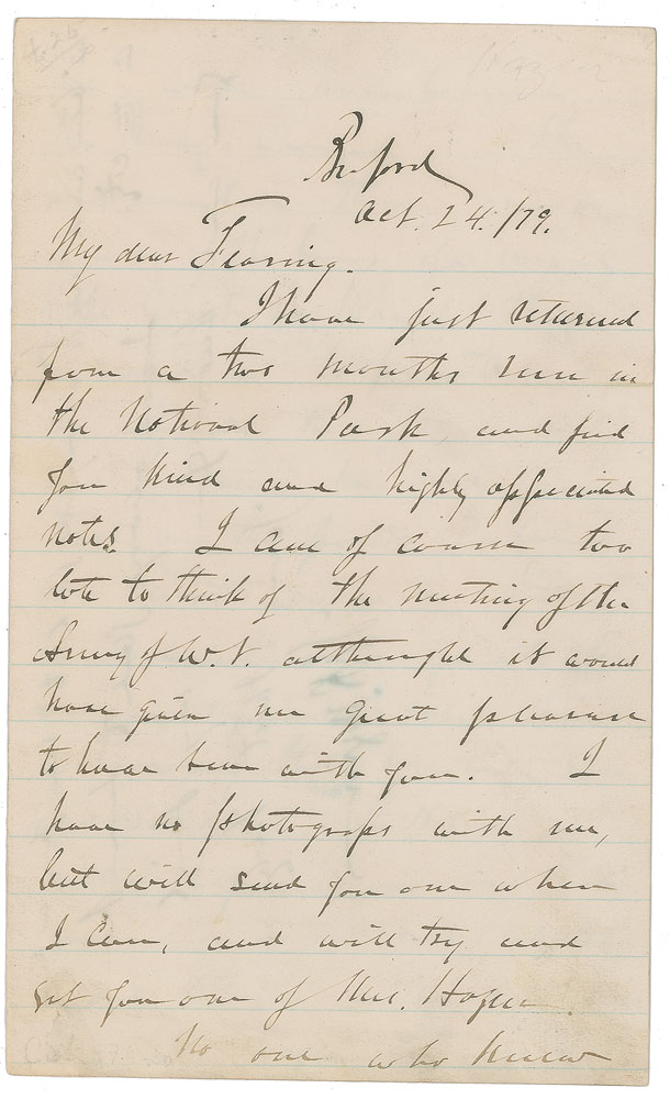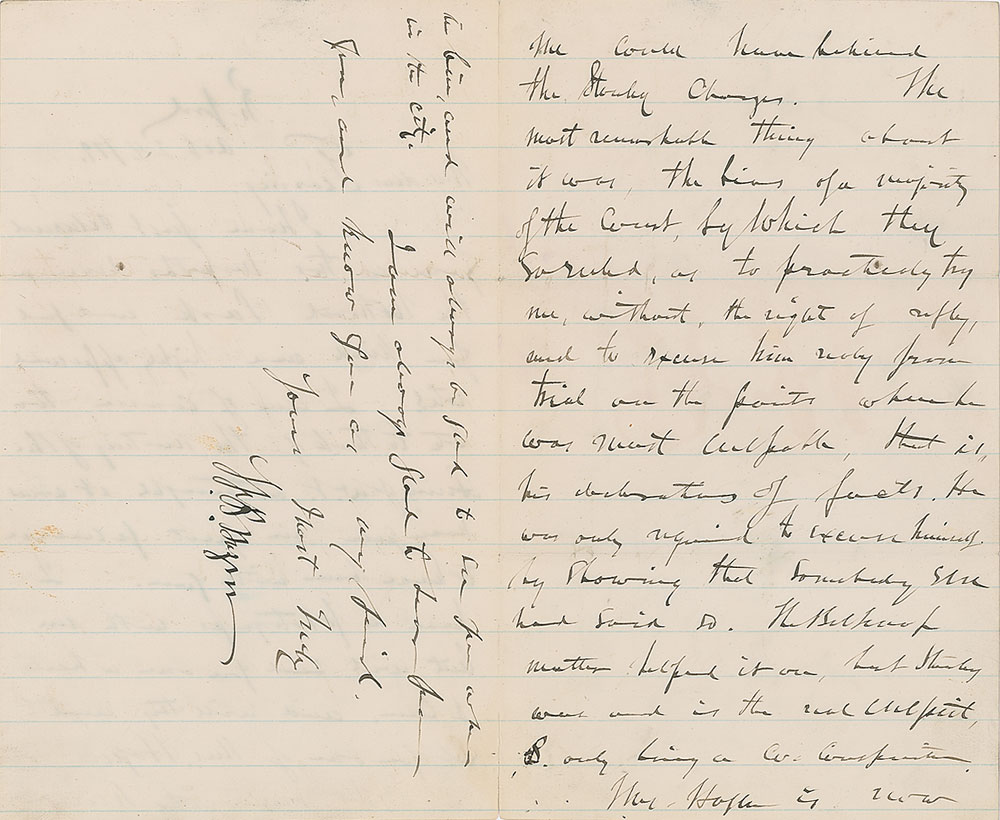 Career United States Army officer (1830-1887) who served in the Indian Wars, as a Union general in the American Civil War, and as Chief Signal Officer of the US Army; his most famous service was defending 'Hell's Half Acre' at the Battle of Stones River in 1862. ALS signed “W. B. Hazen,” three pages on two adjoining sheets, 5.5 x 9, October 24, 1879. In part: "I have returned from a two months leave in the National Park and find your kind and highly appreciated notes. I am of course too late to think of the meeting of the Army of W. V. although it would have given me great pleasure to have been with you. I have no photographs with me, but will send you one when I can?No one who knew me could have believed the Stanley charges. The most remarkable thing about it was the bias of a majority of the Court, by which they so ruled, as to practically try me, without the right of reply, and to excuse him?from trial on the points where he was most culpable, that is his elaboration of facts. He was only required to excuse himself by showing that somebody else had said so. The Belknap matter helped it on, but Stanley was and is the real culprit." In fine condition. Hazen offered testimony in the Belknap corruption scandal that rocked the administration of President Ulysses S. Grant, and resulted in the resignation of Secretary of War William W. Belknap. The scandal was also tied to other disputes that concerned promotions and squabbles over credit for victories in the Civil War. One such dispute was between Hazen and Major General David S. Stanley over the precise location of the monument at Stone's River. Stanley, also busy fighting other generals over credit for the Union victory at the Second Battle of Franklin, argued that the monument was in the wrong place.