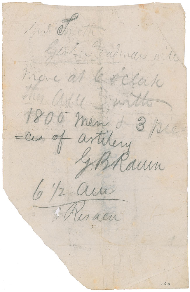 Brigadier general (1829-1909) in the Union Army during the American Civil War, who later served as the US Commissioner of Internal Revenue, as a US Representative from Illinois, and as the US Commissioner of Pensions from 1889 to 1893, a position in which he was responsible for overseeing the acceptance or rejection of pension applications for thousands of Civil War veterans. Civil War era ANS in pencil, signed “G. B. Raum,” one page, 5.25 x 8, no date. Written at "6 1/2 AM, Resaca," a note to General John Smith, in full: "Gen'l Steadman will move at 6 o'clock this AM with 1800 men + 3 pieces of artilery [sic]." In very good condition, with creasing and paper loss.