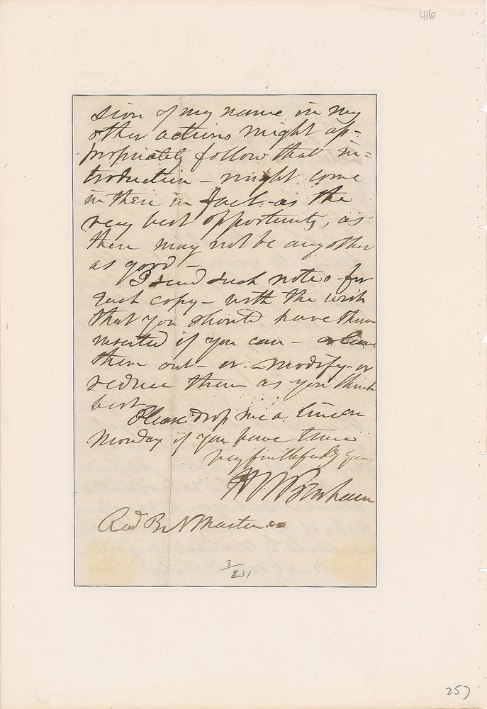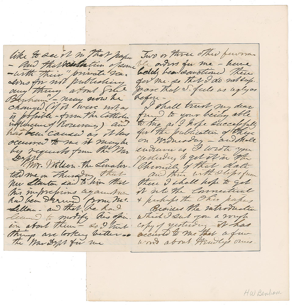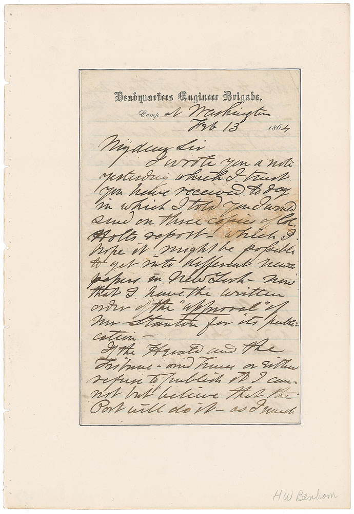 Union general (1813-1884) who led the engineer brigade at the Army of the Potomac. Civil War-dated ALS signed “H. W. Benham,” four pages on two adjoining sheets, 5 x 8, Headquarters Engineer Brigade letterhead, February 13, 1864. Written from "Camp at Washington," in part: "I wrote you a note yesterday which I trust you received to day in which I told you I would send on three copies of Col. Holts report, which I hope it might be possible to get into different newspapers in New York. Now that I have the written order of the 'approval' of Mr. Stanton for its publication. If the Herald and the Tribune—and Times or either refuse to publish it I cannot but believe that the Post will do it as I much I like to see it in that paper—?with their 'private reasons for not publishing any thing about Gen'l Benham'—may now be changed?and has been caused as it has occurred to me it may be by requests from the War Dept. Mr. Wilson—the Senator—told me on Thursday that Mr. Stanton said to him that his impressions against me had been derived from McClellan and that he had learned to mortify his opinions about them. So I trust things are looking better." Professionally inlaid into a slightly larger sheet. In fine condition, with a stain to the first page.