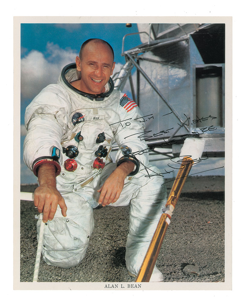 Official color 8 x 10 NASA lithograph of LMP Bean posing in his white space suit in front of the lunar lander, signed and inscribed in black ink, "To Jim—Best Wishes For the Future, Alan Bean.” In fine condition.