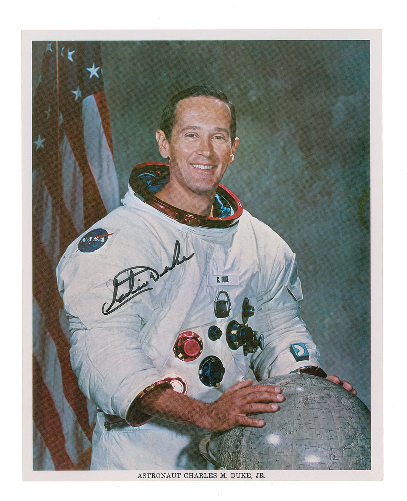 Official color 8 x 10 NASA lithograph of Duke posing in his white space suit with a lunar globe, signed in black felt tip. In fine condition.