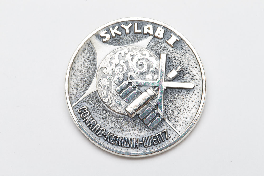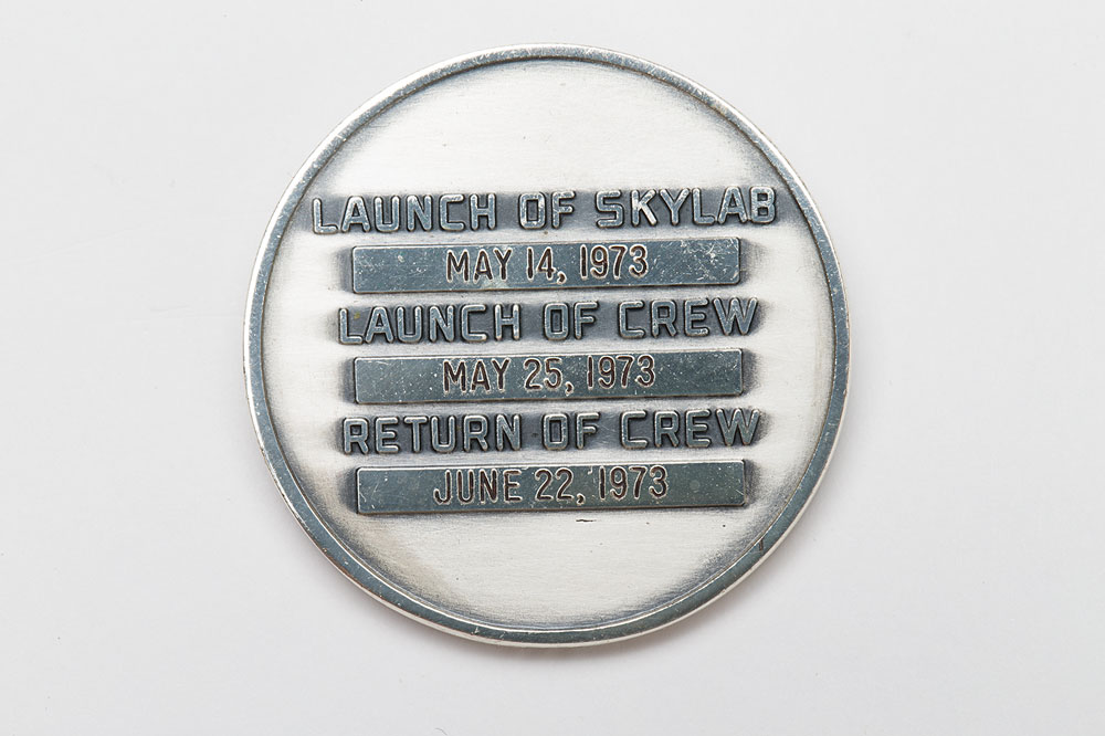 Unflown sterling silver Skylab 2 (SLM-1) Robbins medal, approximately 1.25″ in diameter, with a raised mission insignia design on the face, and the reverse is engraved with the Skylab station launch date of May 14, 1973, the crew launch date of May 25, 1973, and the crew return date of June 22, 1973, with the medal serial numbered "295" on the edge. Condition is mint state.