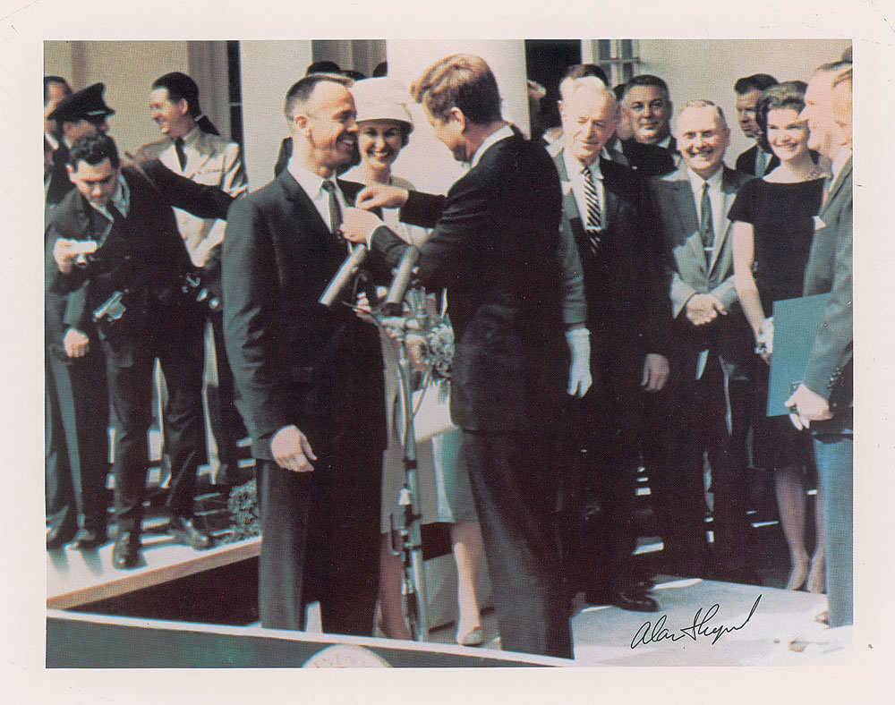 Limited edition color glossy 9.75 x 7.75 cardstock photo of Shepard receiving the NASA Distinguished Service Medal from President Kennedy on May 8, 1961, signed in black ink by Shepard. In fine condition, with creasing to the upper right corner. Accompanied by an authentication sheet numbered 1591/2500.