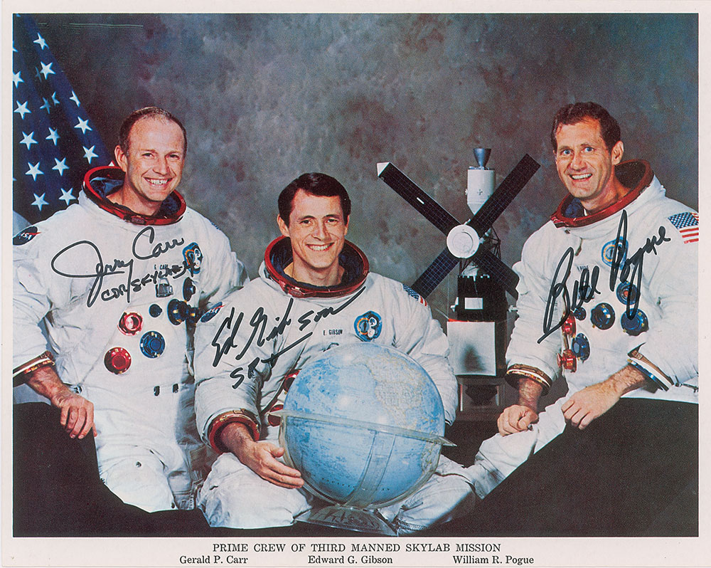 Two items: an official color 10 x 8 NASA lithograph of the Skylab 4 crew posing in their white space suits with a globe and model, signed in black felt tip, "Jerry Carr, CDR/Skylab 4," "Ed Gibson, SPT," and "Bill Pogue"; and a postal cover with a stamped US Navy Recovery Force cachet, postmarked February 8, 1974, signed in black ballpoint by Pogue, Carr, and Gibson. In overall fine condition.