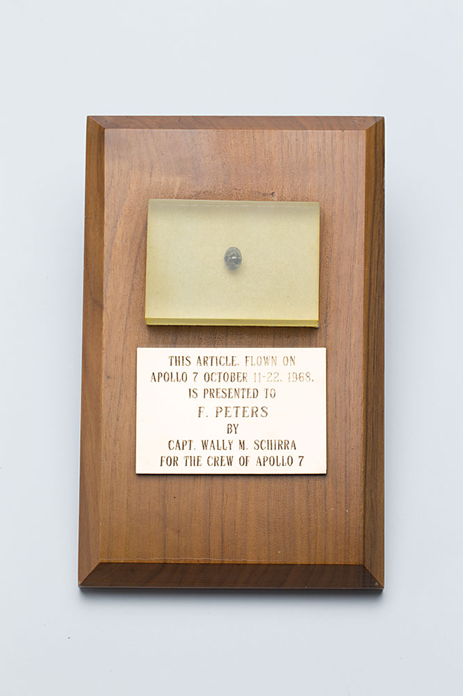 This plaque was awarded to Fred Peters by astronaut Wally Schirra on behalf of the crew of Apollo 7 for his role as spacecraft Project Engineer. The origin of the clip plaque, according to Peters: ‘The Apollo Command Module...at the completion of manufacturing, enters final assembly, then test and checkout and finally shipment to the Cape for flight. The first step prior to beginning final assembly is to mount the CM in a ‘tumble and clean’ fixture to shake out any loose items that may be present after the long manufacturing process. From then on every item entering the CM is accounted for and vacuuming is continuous. This is done to assure there will be no loose items floating around in the CM when it is in zero gravity. A loose item floating in zero g might migrate into a place where it could cause a problem, like short out an electrical circuit. However, as hard as we try it’s virtually impossible to not have something left. Apollo 7 was a very clean CM but this ‘clip’ was one item we missed. The astronauts collected the loose items, had each one potted, mounted on an award plaque...The plaques were then awarded to people they considered key to Apollo 7’s success. To my knowledge only three such award plaques exist.’
