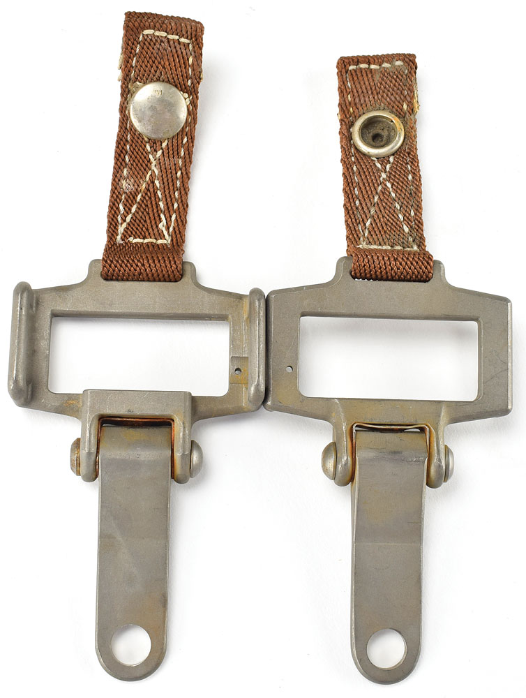 Pair of two metal Apollo Command Module Block II seatbelt brackets with brown nylon straps, each measuring approximately 2.5″ x 7″. The attached reinforced nylon straps feature single female snaps. In overall fine condition.