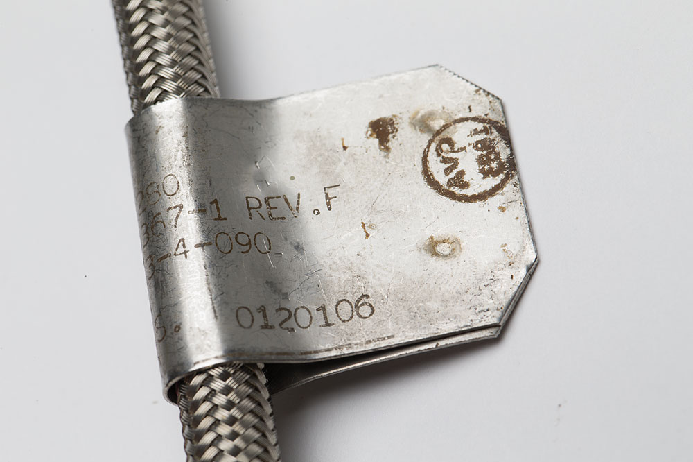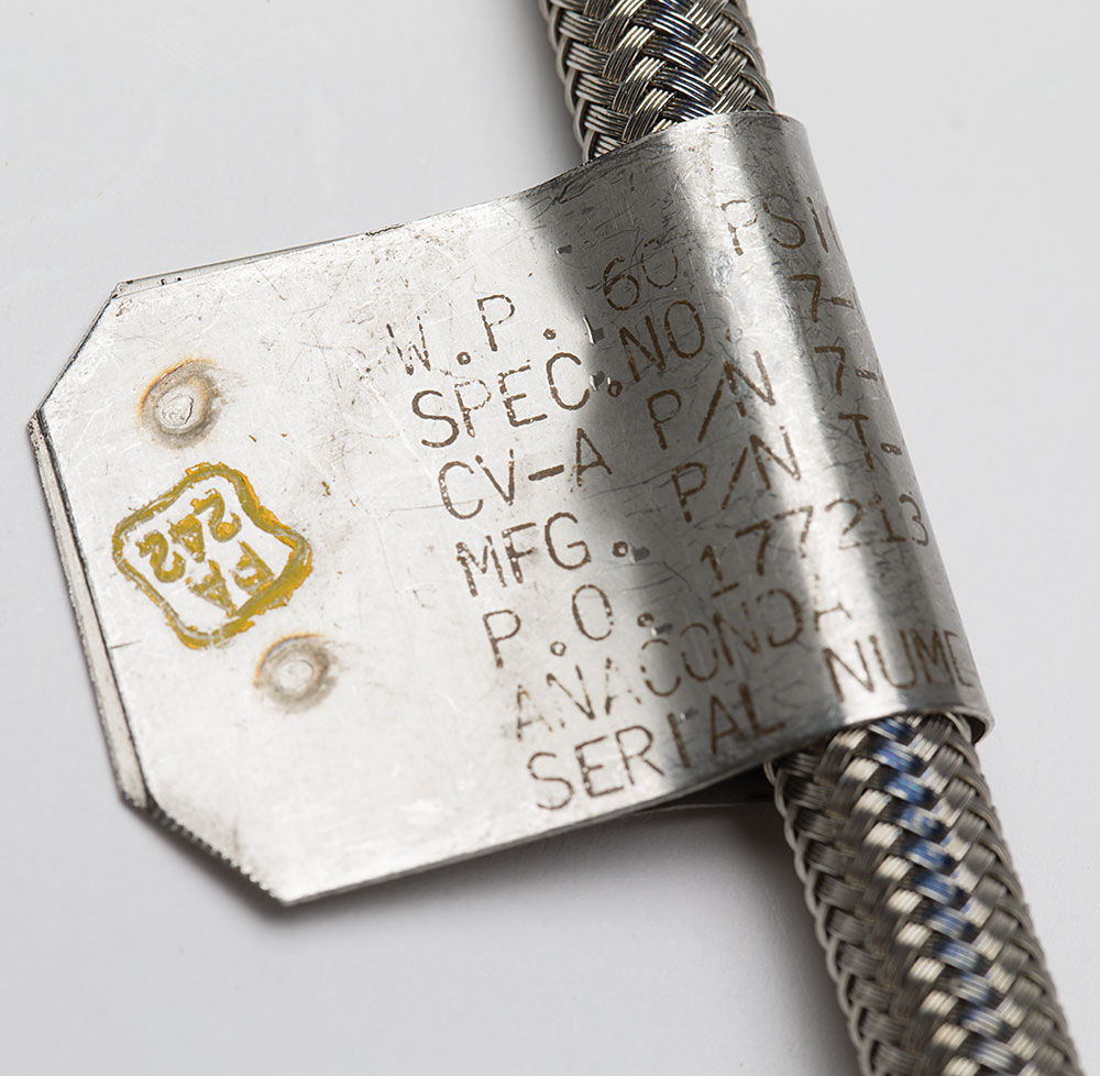 Atlas Rocket Engine Oxidizer Hose, comprised of a braided metal hose measuring 10″ long, with a wraparound metal tag reading: "W.P. 60 PSIG, Spec. No. 7-02280, CV-A P/N 7-04367-1 Rev. F, Mfg. P/N T-103-4-090, P.O. 177213 A, Anaconda U.S., Serial Number 0120106." A green, gray, and white label at the other end reads, "Rocket Oxidizer." In fine condition.