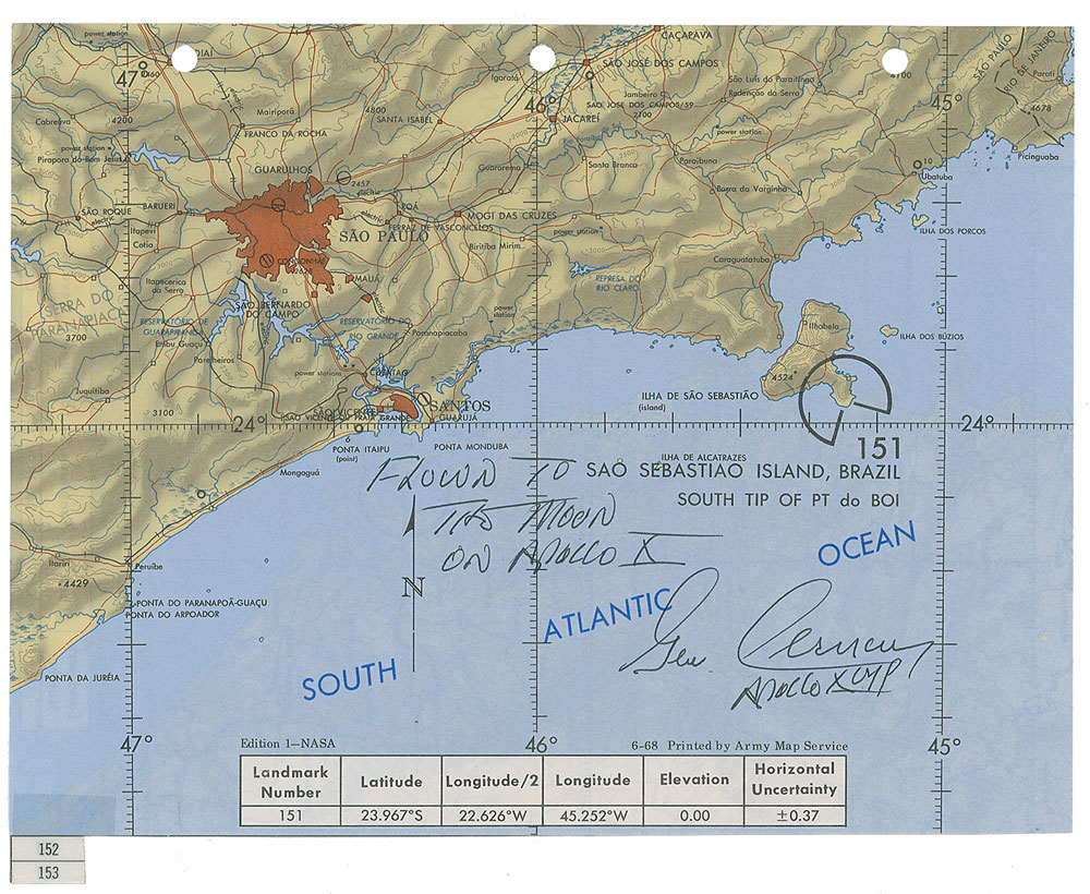 Rare flown double-sided color Earth landmark map carried into lunar orbit during the Apollo 10 mission, signed and flight-certified in black ink, “Flown to the moon on Apollo X, Gene Cernan, Apollo X LMP.” The first edition map, measuring 10.5 x 8.5, with laminated tab marked "152/153,” shows the southeastern coast of Brazil; the signed side locates Sao Sebastian Island and the reverse locates Lagoa Imarui. This is one of the NASA Apollo Earth Landmark Maps used in the mission's Earth Landmark Maps & Photos Book, printed by the Army Map Service in June 1968. Map is done in a scale of 1:1,000,000 and features a chart printed beneath giving latitude, longitude, elevation, and horizontal uncertainty calculations for each identified location. In fine condition.