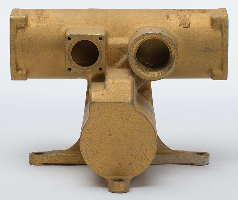 Gold-plated Agena Rocket Engine Cold Gas Thruster Housing, measuring 6.75″ x 5″ x 5″, designed as a tube with a perpendicular can-shaped compartment. In fine condition.