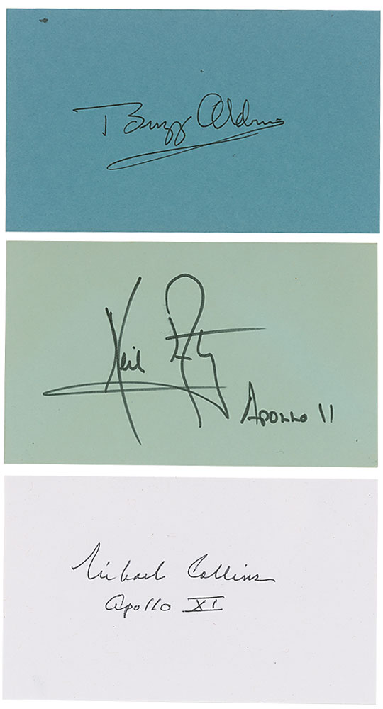 Desirable full set of crisp ink signatures, "Neil Armstrong, Apollo 11," "Buzz Aldrin," and "Michael Collins, Apollo XI," on individual 5 x 3 cards. In overall very fine condition. Accompanied by a certificate of authenticity from Astronaut Central for the Collins signature. A choice set of bold autographs from the crewmen that accomplished history's first lunar landing.