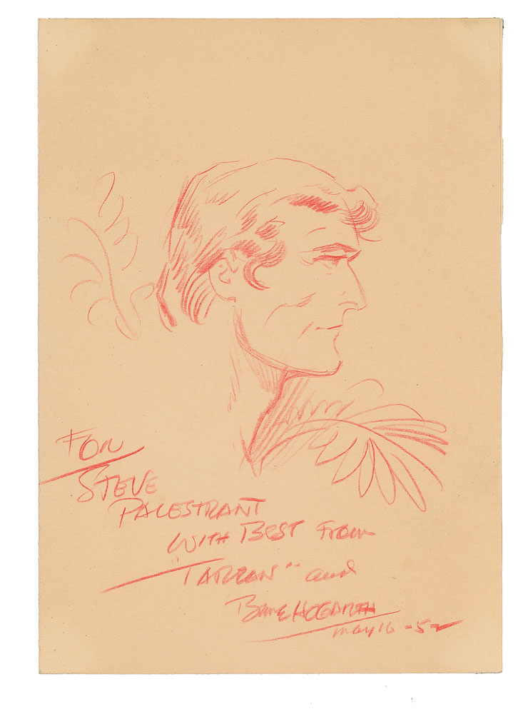 American cartoonist, illustrator, and author (1911-1996) who is best known for his work on the Tarzan newspaper comic strip and his series of anatomy books for artists. Original profile sketch of Tarzan with jungle leaf backdrop on an off-white 6.5 x 9 sheet, accomplished in red artist pencil by Hogarth, who signs and inscribes below, "For Steve Palestrant, with Best from 'Tarzan' and Burne Hogarth, May 16-52." In very fine condition.