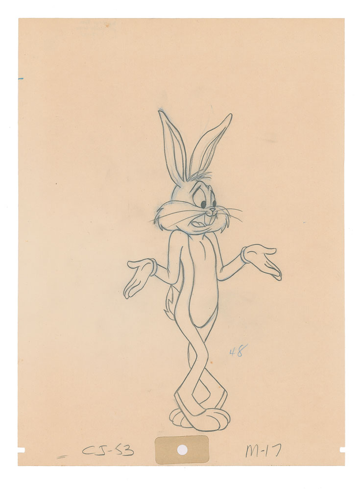 Original production drawing by Chuck Jones of Bugs Bunny in a confused full-length stance. Accomplished in graphite and colored pencil on trimmed 7.75 x 10.5 animation paper, with lower border marked "CJ-53 M-17." In fine condition.