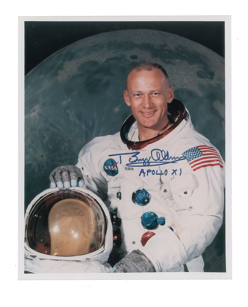 Color semi-glossy 8 x 10 photo of LMP Aldrin posing in his white space suit against a lunar backdrop, signed in black felt tip, "Buzz Aldrin, Apollo XI." In very fine condition.