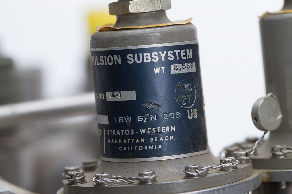 Satellite Helium Regulator Assembly used for spacecraft attitude control, measuring 20″ x 10″ x 9″, with a wraparound Fairchild Hiller/Stratos tag on the outlet port, reading: "Regulator-Propulsion Subsystem, Stratos PN 428000-3, Wt 2.568, TRW PN C402347-1, Rev NC, EO Ltr & No. A-1, Ser No. F840166, TRW S/N 203." The unit is comprised of valves, ports, and piping set upon a metal bracket. In fine condition. An interesting piece which, though associated with an unidentified spacecraft, utilizes components shared with the Apollo program.