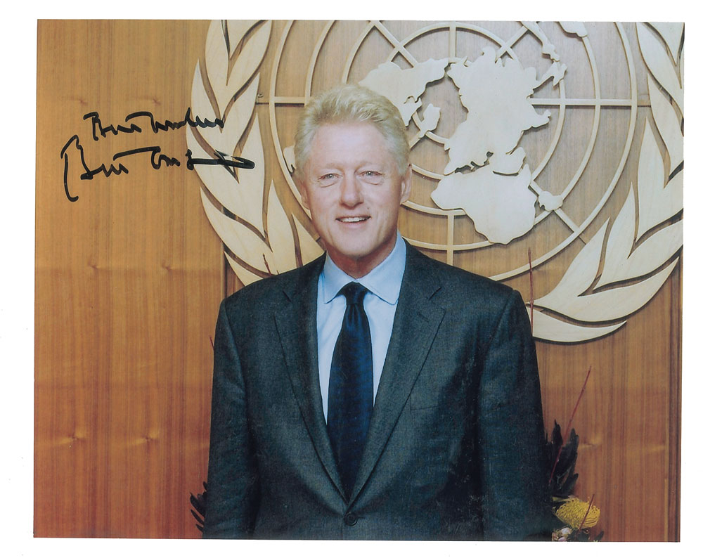 Color glossy 10 x 8 photo of Clinton in front of the United Nations emblem, signed in black felt tip, "Best wishes, Bill Clinton." In fine condition.