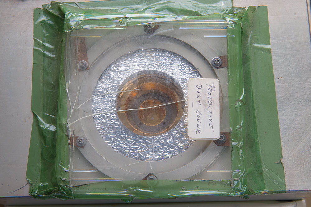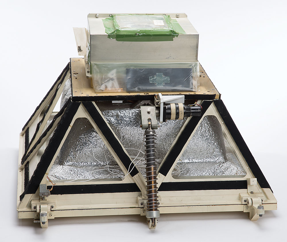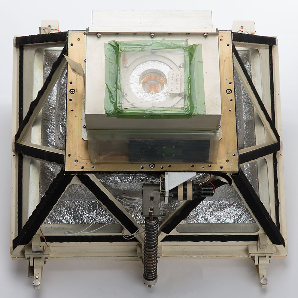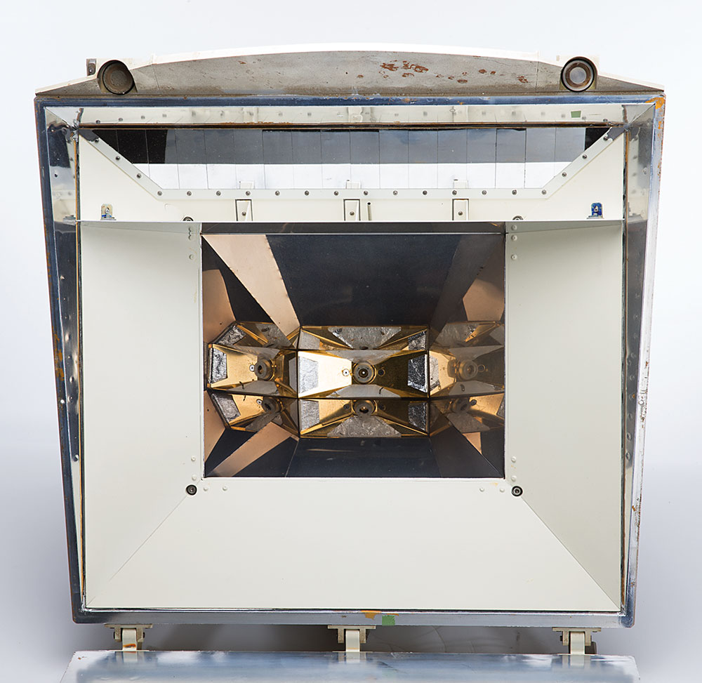 Weather Satellite Sensor Cold Reference, measuring 22″ x 12″ x 20″, featuring silver insulation on the exterior. The rear panel opens to reveal a mirrored interior with optics at the end, protected on the front by a cracked plastic dust cover. In very good to fine condition.
