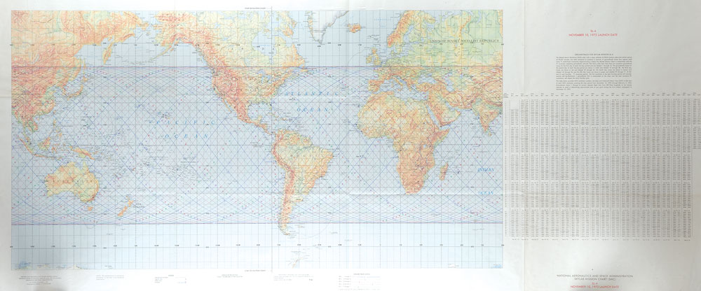 Highly displayable color first edition of the Skylab 4 (SL-4) Mission Chart, 56 x 23.75, dated November 1, 1973, showing the orbit groundtrack data for the mission's first 71 revolutions. Lithographed by DMAAC 11-73 (3CTEA-DJ8), and prepared and published by the Defense Mapping Agency Aerospace Center. In fine, folded condition.