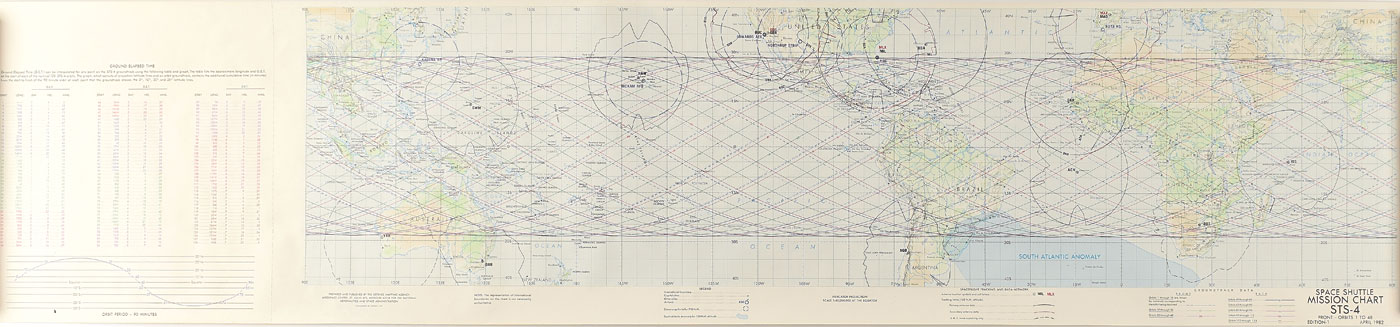 Color first edition of the STS-4 Earth orbital chart, measuring 52 x 11.75, marked in the lower right corner, "Space Shuttle Mission Chart STS-4, Front - Orbits 1 to 48, Edition-1, April 1982." The opposite side features orbits 49 to 128. A table on the front denotes the ground elapsed time for each orbit. Rolled and in fine condition.