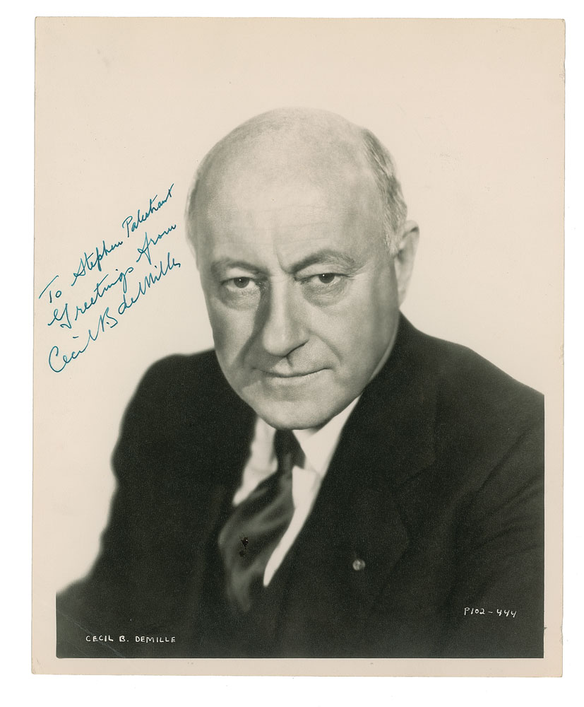 Vintage matte-finish 8 x 10 studio portrait of the acclaimed director in a bust-length pose, signed and inscribed in blue ink, "To Stephen Palistrant, Greetings from Cecil B. deMille.” In fine condition, with a few light creases, and a tiny bit of adhesive residue on his tie.