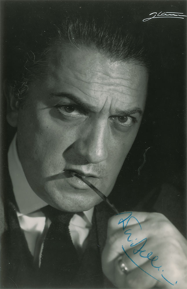Glossy 3.5 x 5.5 close-up photo of the Italian film director, signed in blue ballpoint by Fellini. Reverse bears a photography credit stamp. In fine condition.
