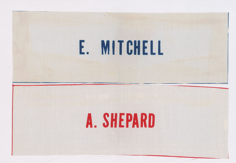 Uncommon pair of Beta cloth name patches, both measure 7.5 x 2.5, with one identified in red block text, "A. Shepard," and the other in blue block text, "E. Mitchell." In overall fine condition, with light staining to Mitchell. From the collection of Dan Schaiewitz, who worked as Extravehicular Crew Training Engineer at KSC.