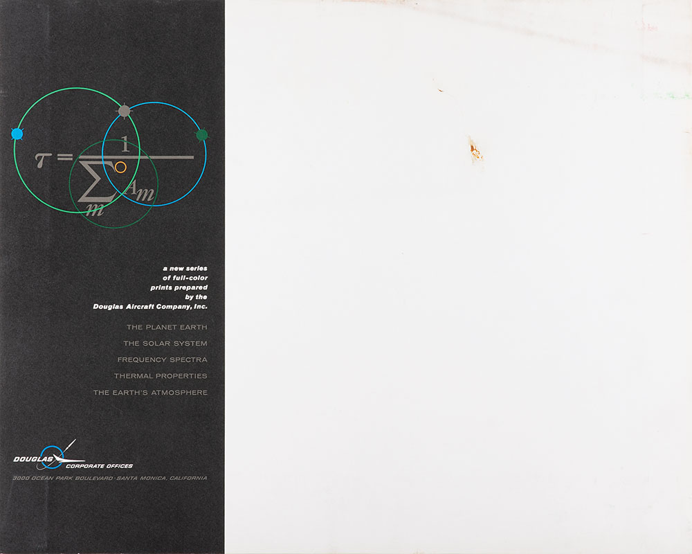Group of five color 20 x 16 educational prints detailing Earth's atmosphere and the solar system, published by the Douglas Aircraft Company in September 1962, with titles including: "Frequency Spectra," "The Planet Earth," "Thermal Properties," "The Solar System," and "Characteristics of the Earth's Atmosphere." Housed in an oversized official Douglas folder. In overall fine condition, with soiling to the front of the folder.