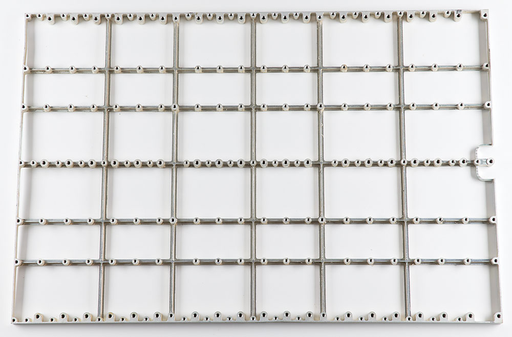 Group of three structural components from an unidentified satellite, including: a 28″ x 18.75″ rectangular metal grid lined with screw holes, marked on the edge, "881020-1, SN001"; a 30″ x 15.75″ satellite part with ports labeled "P1" through "P8," possibly a microwave component, marked "94756 Assy, Part No. 10163-514-1, Serial No. 52P0116"; and a similar 30″ x 16″ satellite part with ports labeled "P1" through "P8," possibly a microwave component, marked "94756 Assy, Part No. 10163-514-1, Serial No. 52P0132." In overall fine condition. A visually interesting lot that would make for appealing space-age wall art. OVERSIZED