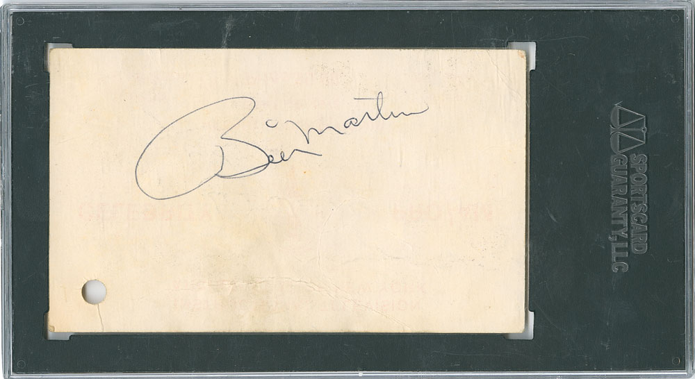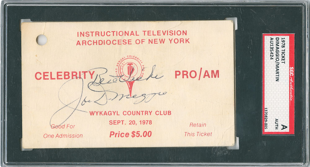 An off-white 5 x 3 ticket for a Celebrity Pro-Am golf event sponsored by the Instructional Television Archdiocese of New York on September 20, 1978, boldly signed on the front in black ballpoint, "Best Wishes, Joe DiMaggio," and on the reverse, "Billy Martin." Encapsulated in an SGC authentication holder. In very good to fine condition, with light scattered creasing. This charity event was held two months after Martin tearfully resigned as New York Yankees manager, paving the way for Bob Lemon to lead the Yankees to another World Series title.
