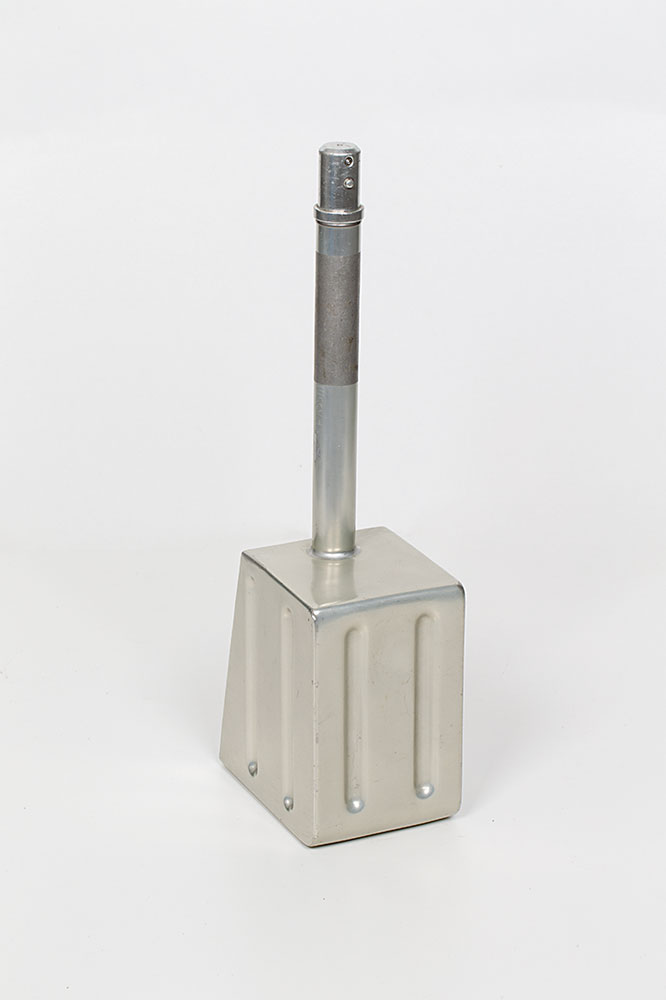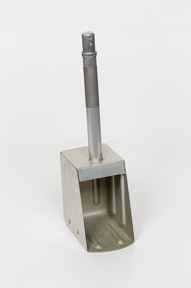 Apollo lunar sampling tools such as this large box scoop were first developed and tested by the US Geologic Survey team at their headquarters in Flagstaff, Arizona. Designed to be rugged yet ergonomic, the lightweight scoop with large bucket mouth featured an extendable quick-disconnect handle with sliding T-top that added another 23″ of reach for the astronaut. After prototypes were approved and subsequently manufactured at the Manned Spacecraft Center, they were then transferred to the Kennedy Space Center for Apollo 11 EVA training in June 1969.