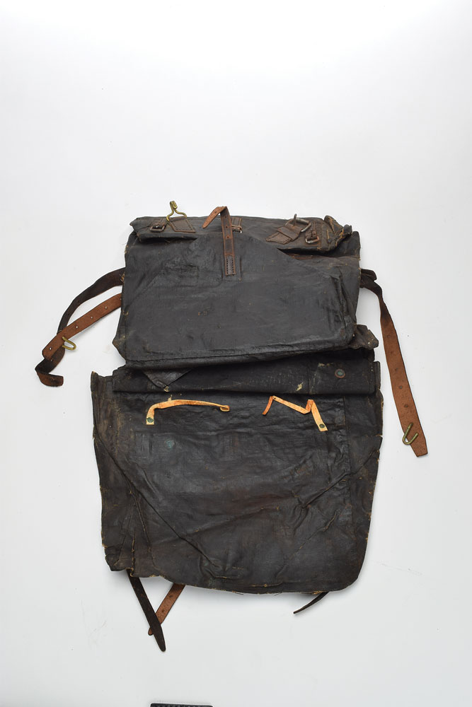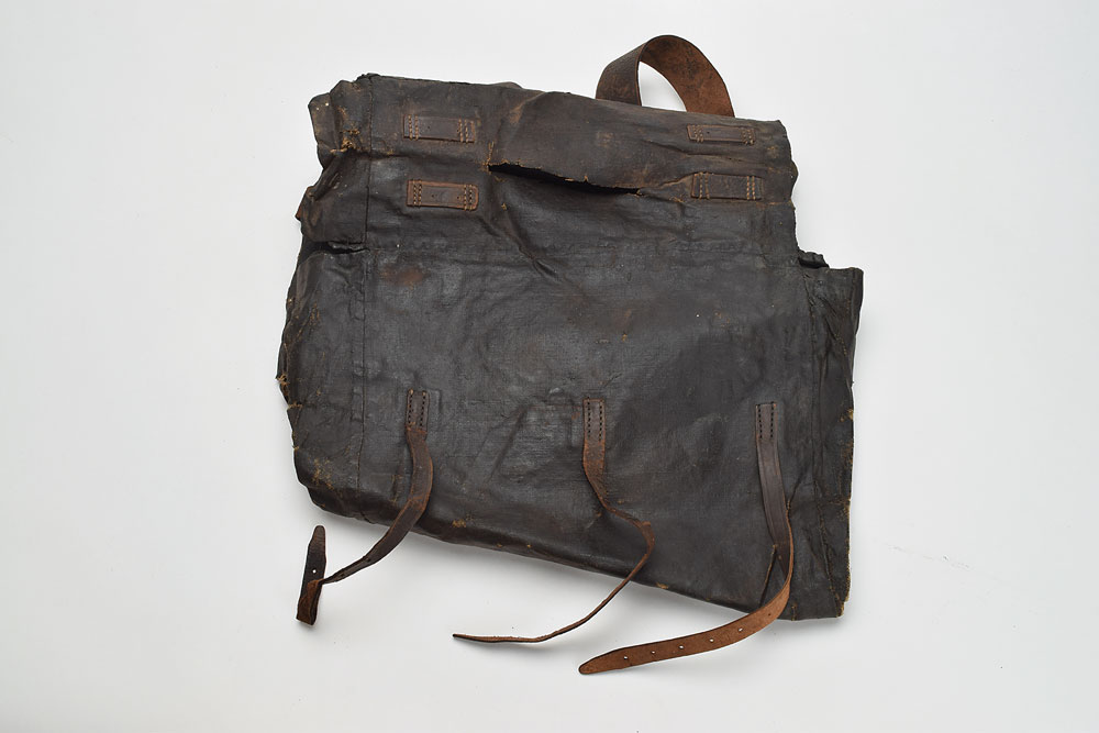 A regulation, tarred canvas knapsack with brown leather straps, thongs, and billets. The fabric has crazing across much of the surface, with some flaking and wear at the edges of the panels, and there is a large hole at the flex point at the base of the cover flap. The leather components have dried somewhat over time, but is still fairly flexible and supple overall, and the metal buckles and fittings are still present. In fair overall condition.