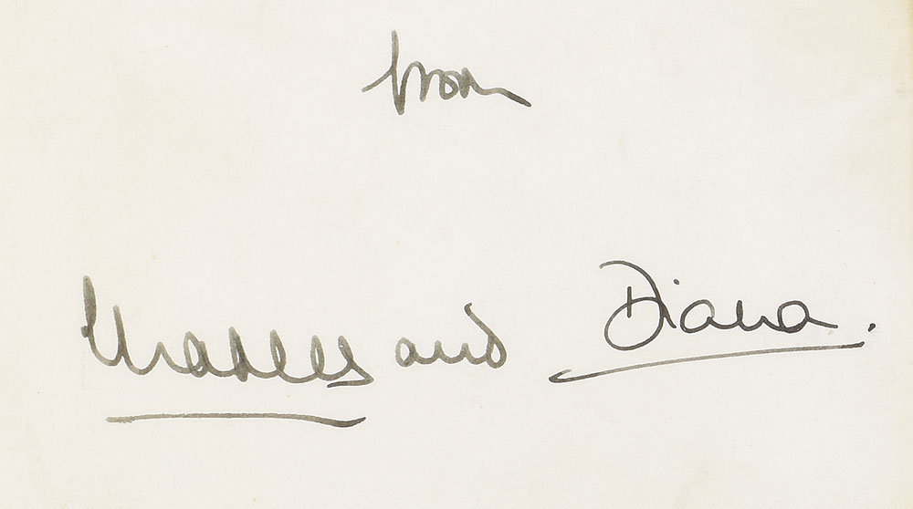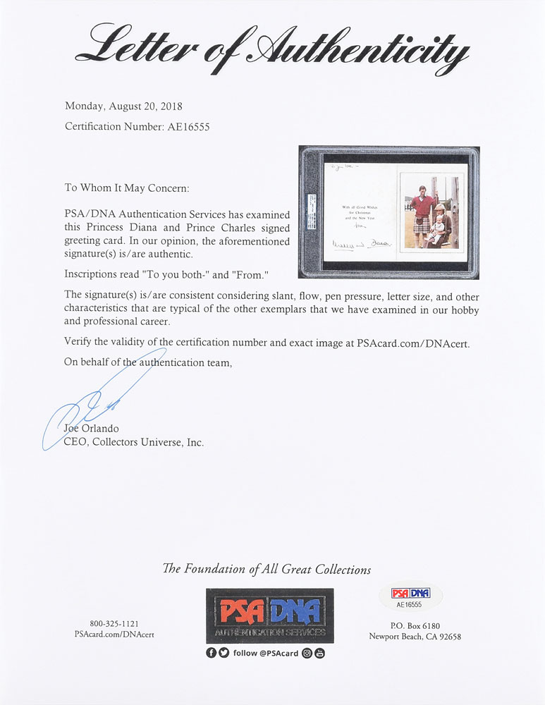Christmas card from 1983 embossed on the front with the Prince of Wales’s feathers and Order of the Garter motto and the Spencer family arms, measuring 10.5 x 7.25 open, featuring an affixed color photo of Charles and Diana, the latter sitting with Prince William on a swing, signed and inscribed in ink, “To you both—from Charles and," and, "Diana.” Encapsulated in a plastic PSA/DNA authentication holder. In fine condition, with scattered soiling (heaviest along the inner hinge), a scratch to the photo, and a round sticker on the back of the card. Accompanied by a full letter of authenticity from PSA/DNA.