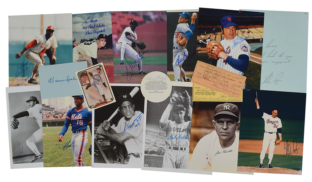 Collection of 17 items signed by baseball greats and Hall of Famers, some inscribed, including: Willie Mays (SP), Tom Seaver (SP), Nolan Ryan (SP and signature), Casey Stengel (signature), Warren Spahn (check and signature), Joe Wood (check), Carl Hubbell (card), Lou Brock (SP), Don Drysdale (SP), Vida Blue (SP), Orel Hershiser (SP), Lee Smith (SP), Dwight Gooden (SP), Bob Feller (SP), and Joe Sewell (SP). In overall fine condition.