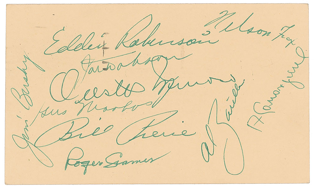 Vintage fountain pen signatures of Nellie Fox, Eddie Robinson, Minnie Minoso, Joe Dobson, Al Zarilla, Chico Carrasquel, Doc Cramer, Billy Pierce, Gus Mancuso and Jim Busby on a 5.5 x 3.25 government postcard, postmarked August 13, 1951. In fine condition. A desirable early example of Fox, who was in his second full Major League season.