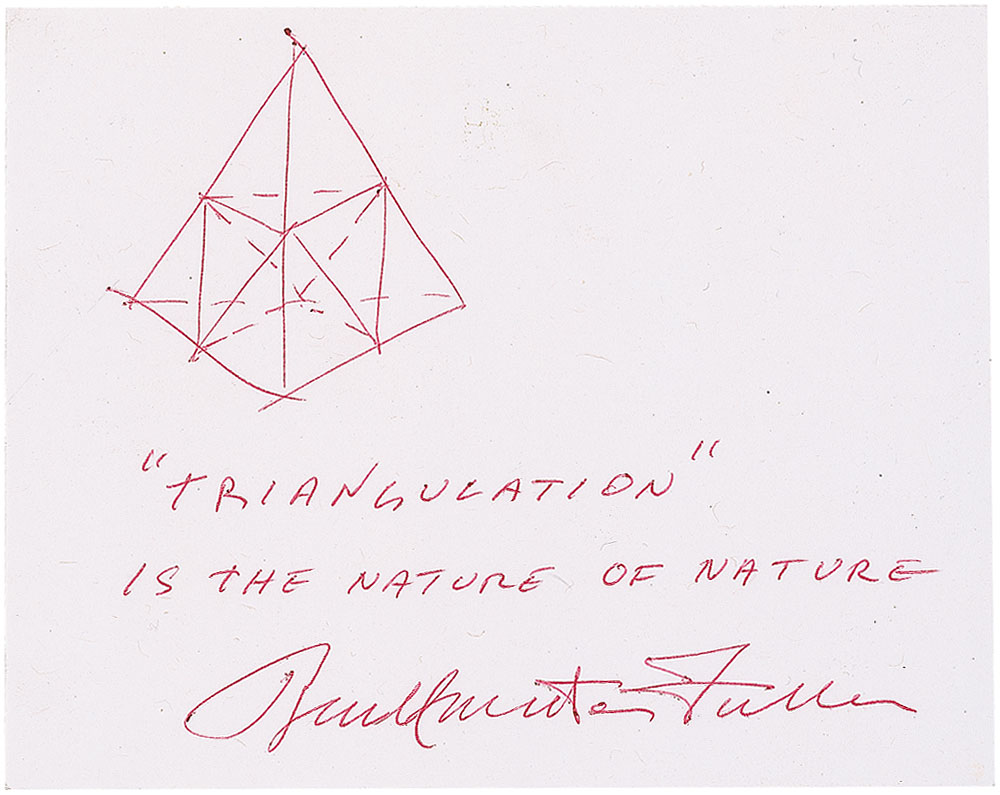 Visionary American architect, inventor, writer, and philosopher (1895-1983) perhaps best known for inventing the geodesic dome, one of the signal developments in modern design and engineering. Original red ballpoint sketch of a pyramid on a white 5 x 4 card, signed underneath, "'Triangulation' is the nature of nature. Buckminster Fuller." In fine condition.