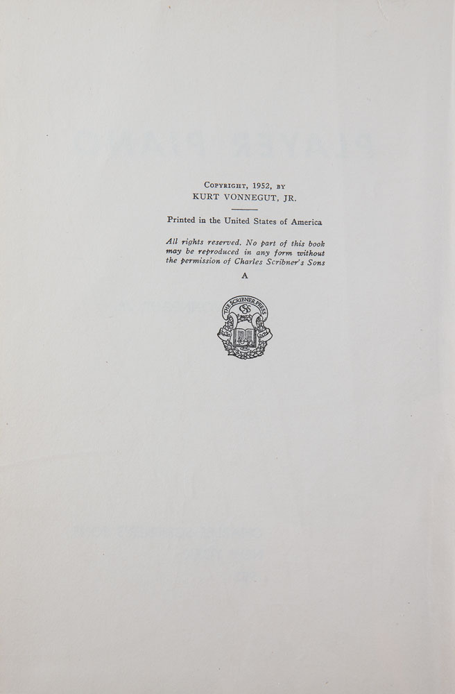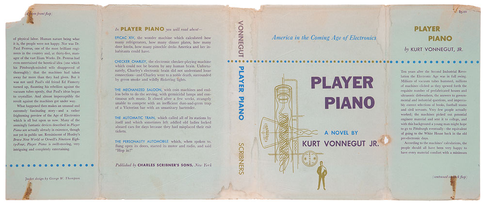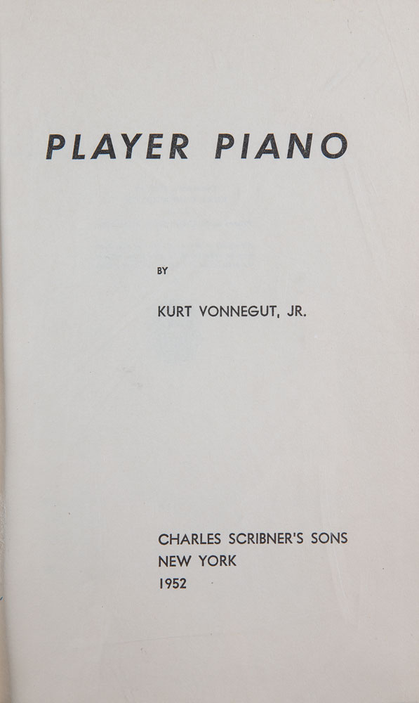 Signed book: Player Piano. First edition. NY: Charles Scribner's Sons, 1952. Hardcover with dust jacket, 5.75 x 8.5, 295 pages. Signed vertically on the front pastedown in blue ballpoint by Vonnegut. Autographic condition: fine, with creasing beneath the signature, inherent to the pastedown. Book condition: VG/VG-, with sunning to spine, and some dampstaining and paper loss to dust jacket.