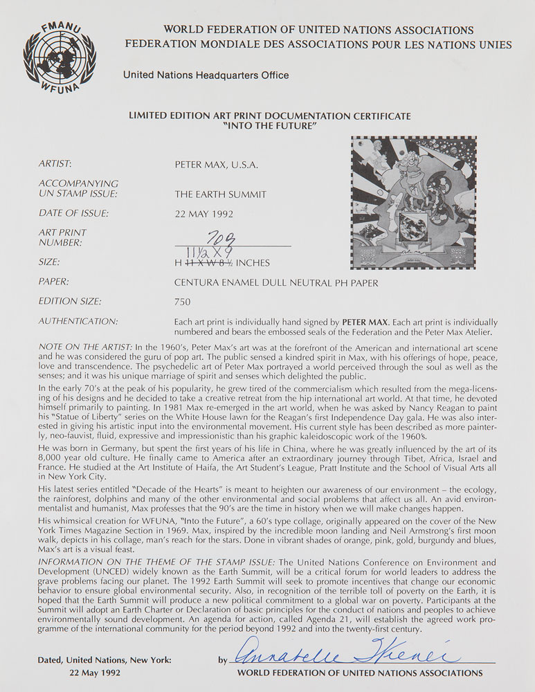 Color limited edition 9 x 11.5 lithograph entitled 'Into the Future,' issued in 1992 in conjunction with the United Nations 'Earth Summit' stamp, numbered 709/750, signed in the lower border in green felt tip, "Max." In fine condition, with very slight overall fading. Accompanied by a certificate of authenticity from the World Federation of United Nations Associations.