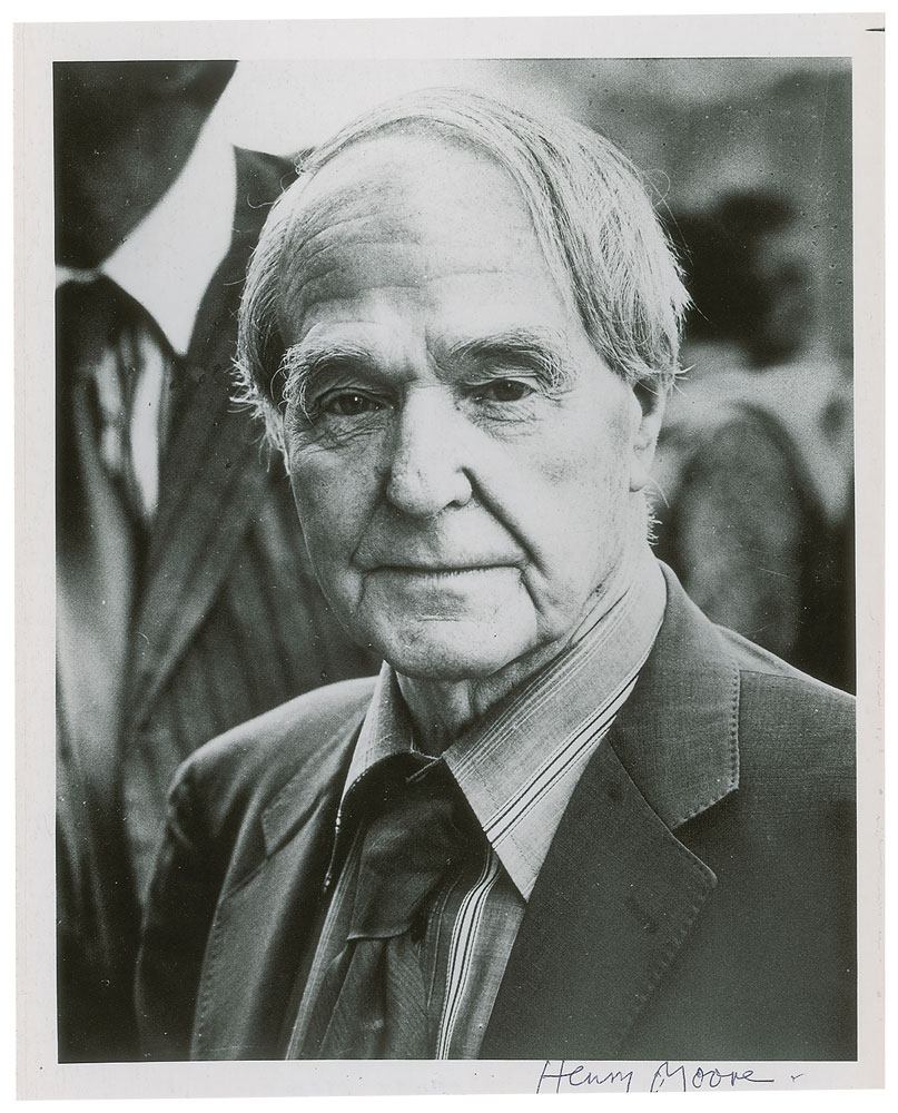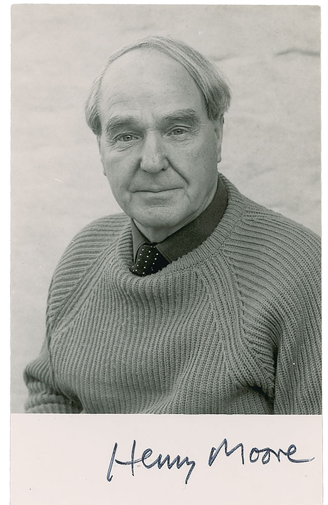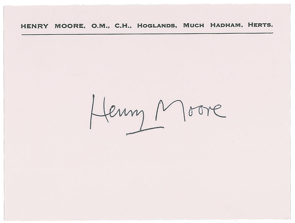 Three items signed by the great English sculptor: a glossy 8 x 10 close-up portrait of Moore, signed in the lower border in black ballpoint; a matte-finish 3.25 x 5.5 portrait of Moore in a sweater, signed in the lower border in black felt tip; and an ink signature on a personal 4.5 x 3.5 card. In overall fine condition, with some light creasing to the larger photo.