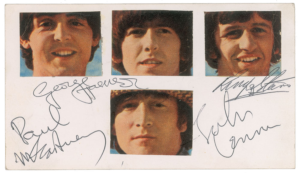 Vintage mid-1966 black ballpoint signatures of John Lennon, George Harrison, Paul McCartney, and Ringo Starr on a white 6.25 x 3.5 card with affixed color images of the band as they appeared in the film Help! In fine condition. Accompanied by a certificate of authenticity from Tracks, as well as a letter of authenticity from noted Beatles expert Frank Caiazzo, who notes that the signatures were obtained "when The Beatles were in Germany to perform concerts there in 3 cities: Munich, Essen, and Hamburg, with this short tour being referred to as 'The Bravo-Beatles-Blitztournee.' These shows took place between June 24 and 26, 1966." The 'Bravo-Beatles-Blitztournee' was the Beatles' only full tour of Germany, a six-show and three-day leg that culminated in their first return to Hamburg since their days at The Star-Club. Beatles autograph sets from 1966—in particular from this brief German tour, undertaken just days after the final recording session of Revolver—are incredibly scarce and desirable.
