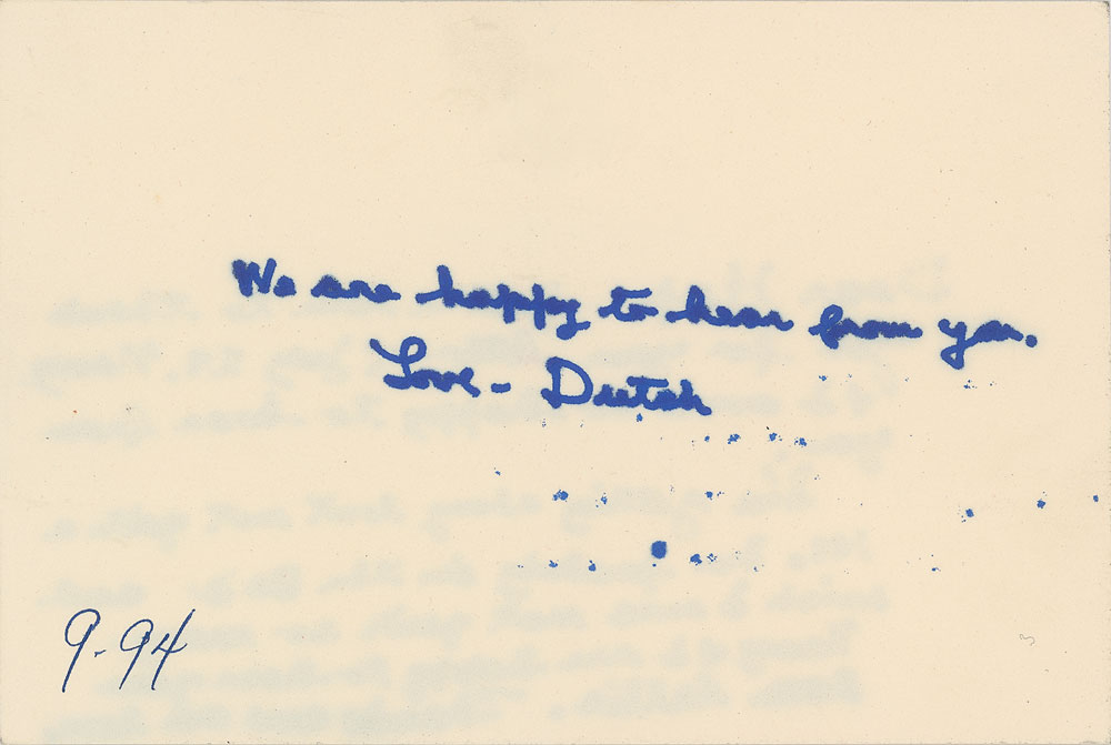 ALS signed "Dutch," one page both sides, 6.25 x 4.25, personal letterhead, no date. Letter to Lydia Hupfer McArthur, in full: "Just a line to thank you for your letter of July 29. Nancy & I were so happy to hear from you. I'm getting along but not quite a 101. I'm pushing in the 80's and wish I was not quite so many. Nancy & I are happy to have your letter. Thanks and our love. We are happy to hear from you." Reverse of page bears a collector's date notation, "9-94." In fine condition. Accompanied by a copy of a previous letter. Lydia Hupfer 'Hup' MacArthur was the widow of Pete MacArthur, program director of WOC in Davenport, Iowa. In 1932, MacArthur had given a then 21-year-old Reagan his first job as a sports announcer. They would remain friends until her passing at the age of 102 in 1995.
