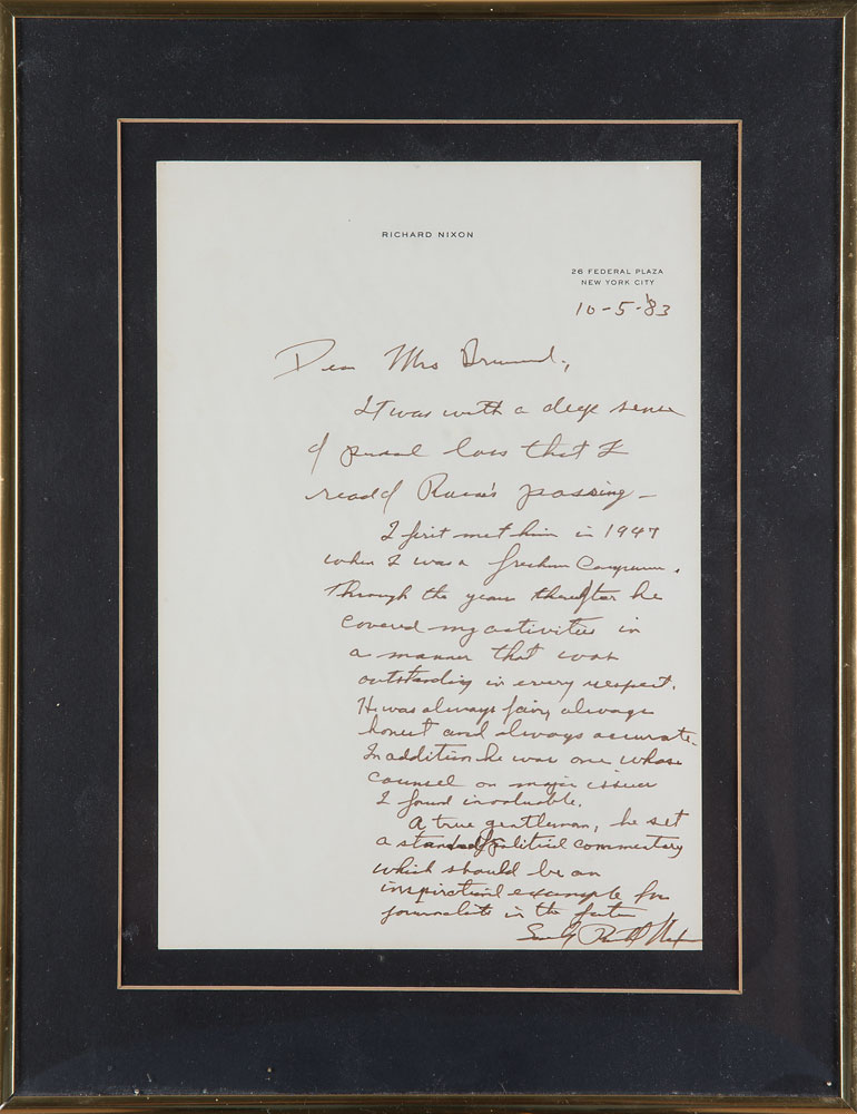 ALS, one page, 7.25 x 10.5, personal letterhead, October 5, 1983. Letter to the widow of journalist Roscoe Drummond, in full: "It was with a deep sense of personal loss that I read of Roscoe’s passing. I first met him in 1947 when I was a freshman Congressman. Through the years thereafter he covered my activities in a manner that was outstanding in every respect. He was always fair, always honest, and always accurate. In addition, he was one whose counsel on major issues I found invaluable. A true gentleman, he set a standard for political commentary which should be an inspirational example for journalists in the future." Matted and framed to an overall size of 11.5 x 14.75. In fine condition. During his career, Drummond was syndicated columnist for 'State of the Nation' in the L.A. Times, the director of information for the Marshall Plan, and executive editor of the Christian Science Monitor.