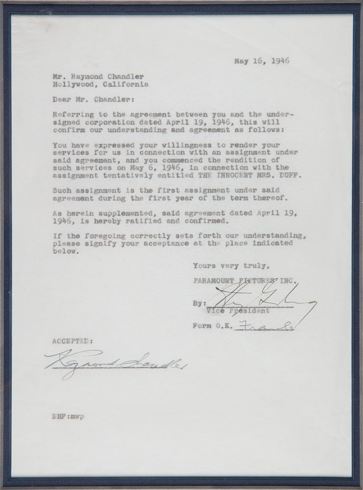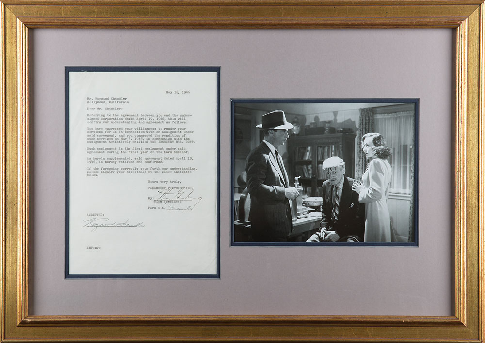 DS, one page, 7.5 x 10.25, May 16, 1946. Agreement between Chandler and Paramount Pictures for him to render services "in connection with an assignment…tentatively entitled The Innocent Mrs. Duff." Floridly signed at the conclusion by Chandler in fountain pen, and countersigned by two Paramount representatives. Beautifully double-matted and framed with a photo from the 1944 film Murder, My Sweet, to an overall size of 24.5 x 17.5. In very good to fine condition, with creasing to the upper right corner area. This was to be a screen adaptation of Elisabeth Sanxay Holding's story of the same title, but Chandler struggled in his efforts. Despite his love for the original story—Chandler considered Holding the best mystery writer of them all—by the end of May he was already irritated by the project, writing in a letter to James Sandoe of the task, 'I'm bored with it already…the business of adapting things for the screen is more work than it is worth.' The screenplay was never finished.