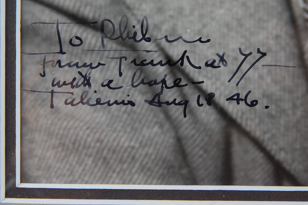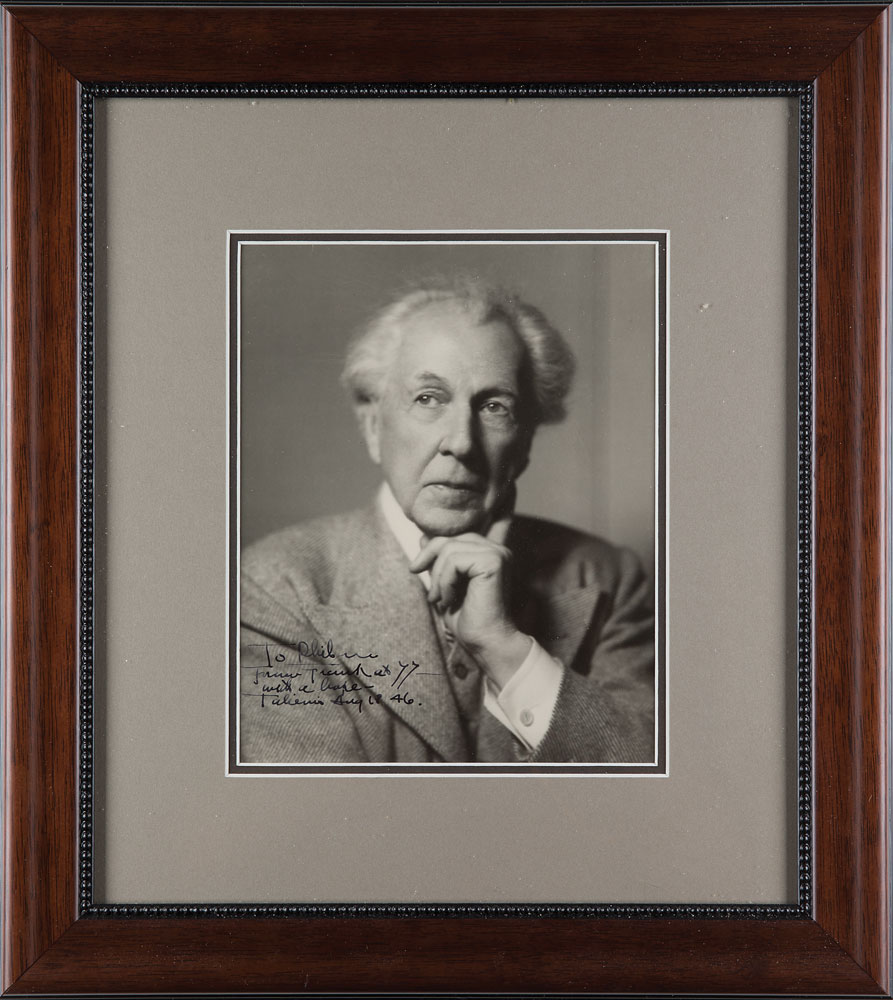 Magnificent pearl-finish 7.25 x 9.25 photo of Wright deep in thought, boldly signed and inscribed in fountain pen, "To Phil—From Frank at 77—with a hope, Taliesin, Aug. 18 46." Double-matted and framed to an overall size of 16 x 18. In fine condition. Taliesin was Wright's famed home and studio in Wisconsin, which he designed and built in 1911. A scarce and absolutely spectacular signed portrait of the architectural master.