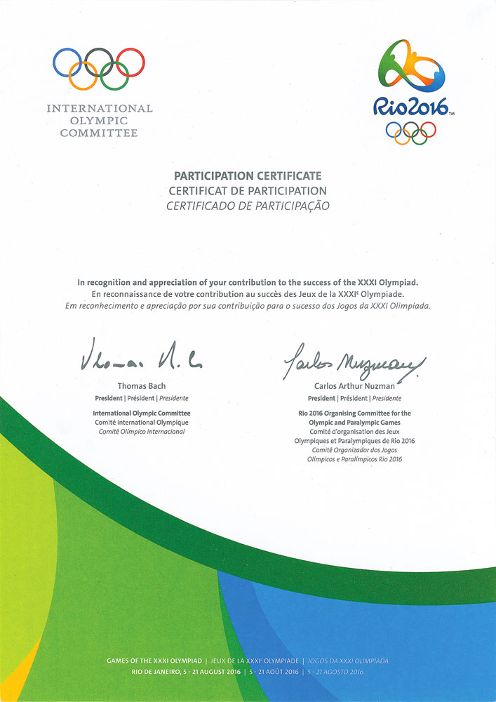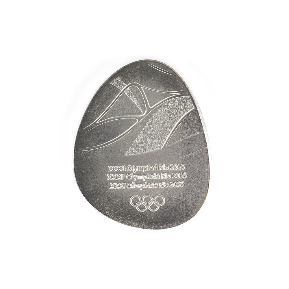 Official participation medal of the Rio 2016 Summer Olympic Games. Alloy copper, 44 x 50, 100 gm. The front features the Rio Games logo above Olympic rings; the reverse bears flowing designs above three rows of raised text, “XXXI Olympiad Rio 2016.” Includes the original presentation holder and slipcase, as well as an unissued official participation certificate of the Rio 2016 Summer Olympic Games, one page, 8.25 x 11.75, with IOC and Rio logos to upper corners and trilingual text below, reading: "In recognition and appreciation of your contribution to the success of the XXXI Olympiad." In fine condition.