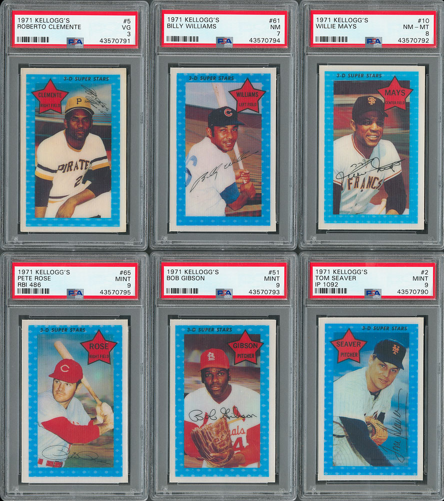 Very high-grade set of this scarce Kellogg's issue. Of all the Kellogg's sets produced in the 1970s and 1980s, the 1971 set was the only set not available by mail order. Kids just had to chow down on the sugary grains to obtain a picture of their favorite player. Loaded with Hall of Famers, this set is mostly high grade, with a half dozen PSA graded.