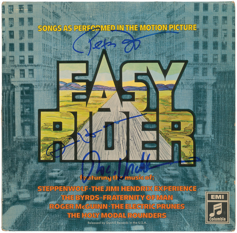 Easy Rider soundtrack album signed on the front cover in blue felt tip by Jack Nicholson, Peter Fonda, and Dennis Hopper. In fine condition, with a few creases to the right side. The record is included. From The John Brennan In-person Autograph Collection.