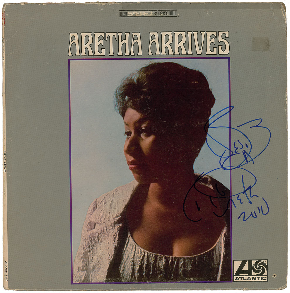Aretha Arrives album signed on the front cover in blue felt tip, "Best, Aretha, 2010." In very good condition, with a discount hole to the lower right corner, old price sticker residue, and clear tape to the partially separated top edge. The record is included. From The John Brennan In-person Autograph Collection.